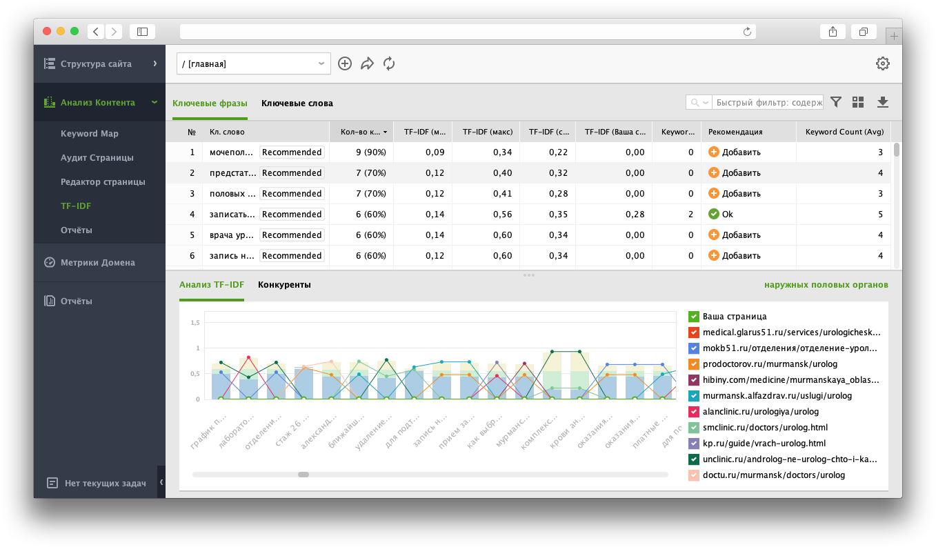 - Полный SEO-аудит контента. Оценим уровень оптимизации любой страницы и любого ключевого слова на основании сравнения с основными конкурентами, а также узнаем, что помогает вашим конкурентам быть в топе в поисковых систем.