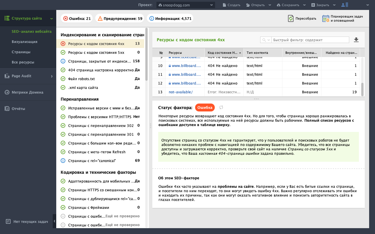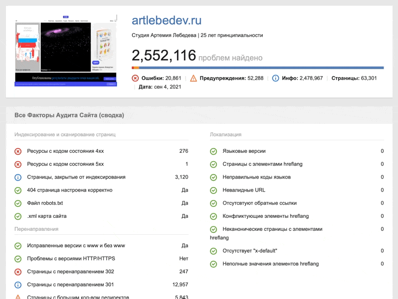 - После сканирования вашего сайта, мы объединяем все данные в удобный отчет, в котором казаны не только проблемы, но и есть ссылки на конкретные страницы с проблемами, чтобы можно было легко перемещаться. Более подробно можно посмотреть на примере отчета, который мы прикладываем выше.